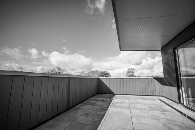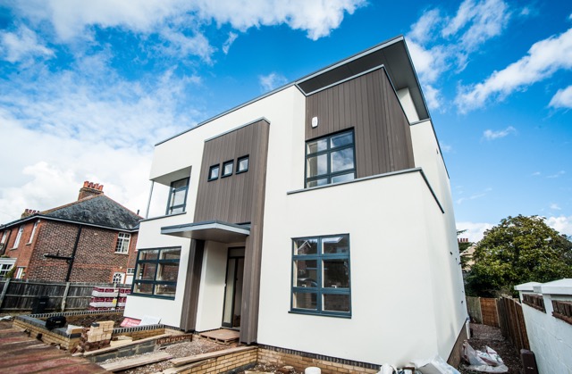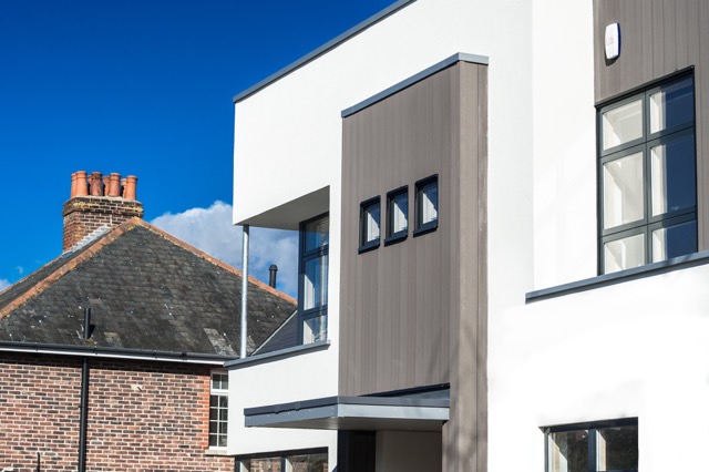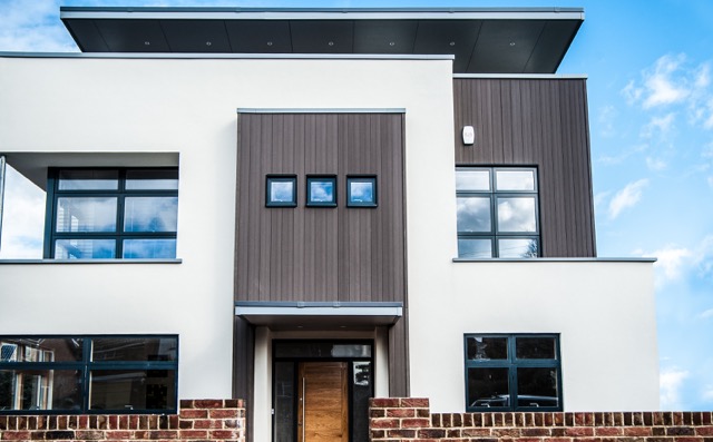 It is a clever formulation of boxes under single ply membrane roofing, with Permarock render system and Twinson cladding in Turf Brown. The windows are from Velfac and these are a timber internal finish with a grey Aliminium external finish and triple glazed.